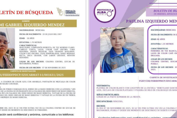 La Fiscalía General del Estado de Puebla solicita apoyo para localizar a Jeremías Gabriel Izquierdo Méndez (18 años) y Paulina Izquierdo Méndez (8 años), desaparecidos el 7 de noviembre de 2025 en la colonia Centro. 📋 Descripción de los menores: Jeremías Gabriel• Estatura: 1.70 m• Complexión: robusta• Tez: moreno claro• Cabello: corto, lacio, café oscuro•…