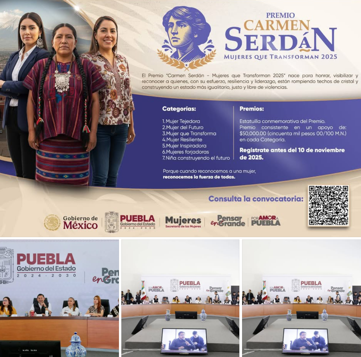 Es importante mencionar que las interesadas en participar en el Premio “Carmen Serdán, Mujeres que Transforman 2025”, pueden enviar sus postulaciones al correo secretaria.mujeres@puebla.gob.mx a más tardar el 10 de noviembre de 2025. La convocatoria completa puede consultarse en el sitio oficial: sm.puebla.gob.mx.