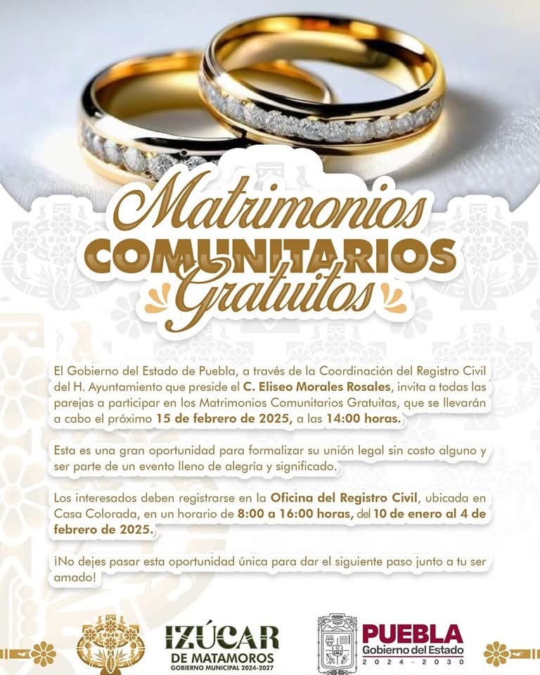 El Gobierno del Estado de Puebla, a través de la Coordinación del Registro Civil del H. Ayuntamiento que preside el C. Eliseo Morales Rosales Matamoros, invita a todas las parejas de nuestro Municipio a participar en los Matrimonios Comunitarios Gratuitos, que se llevarán a cabo el próximo 15 de febrero de 2025, a las 14:00 horas.