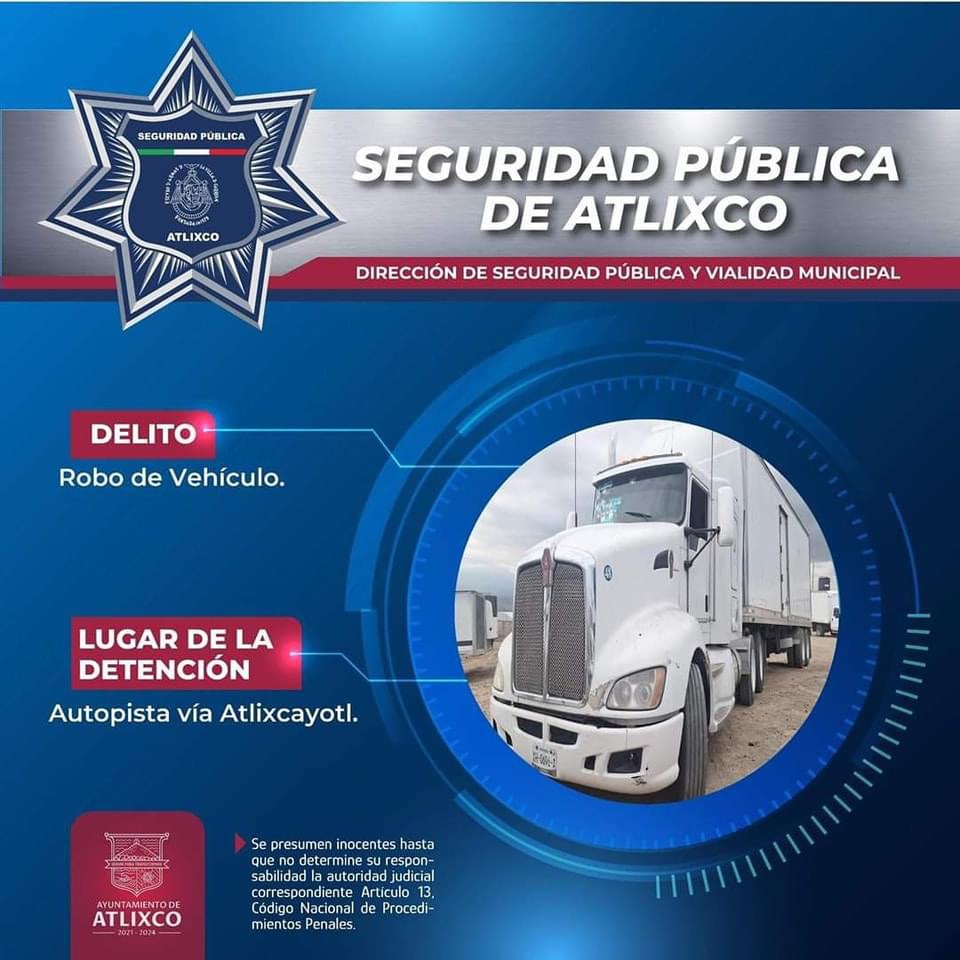 Gracias al monitoreo efectivo y oportuno de nuestra secretaria mediante el 911 y el seguimiento por tecnología GPS, elementos de seguridad publica de nuestro municipio logran interceptar en carretera federal Puebla – Izúcar de Matamoros a un tracto camión con reporte de robo, se realiza la detención pertinente de un masculino a bordo y para su seguimiento correspondiente es puesto a disposición del ministerio público.