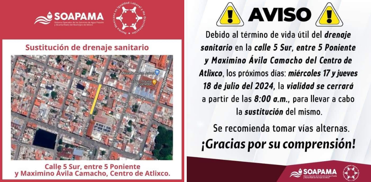 Por reparación de drenaje sanitario en la calle 5 Sur, entre la 5 Poniente y Maximino Ávila Camacho del Centro de Atlixco, los próximos días: miércoles 16 y jueves 17 de julio, la vialidad permanecerá cerrada a partir de las 8:00 a.m. para llevar a cabo los trabajos de sustitución.