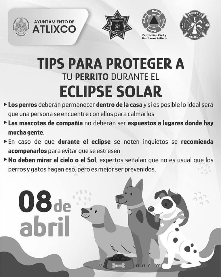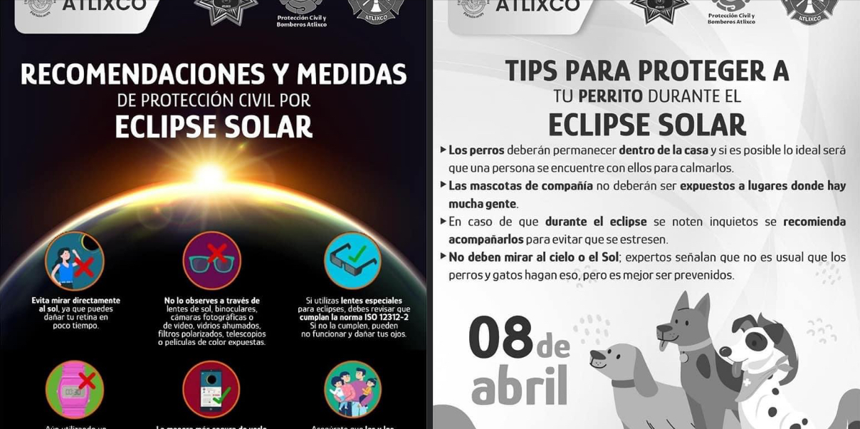 Ante el eclipse solar que ocurrirá el próximo lunes 8 de abril, la Coordinación de Protección Civil del municipio de Atlixco, emite varias recomendaciones para evitar daños en la vista que pudieran ser irreversibles, toda vez que la exposición a la luz intensa que se produce durante el fenómeno genera graves quemaduras en la retina que podrían derivar en ceguera permanente.