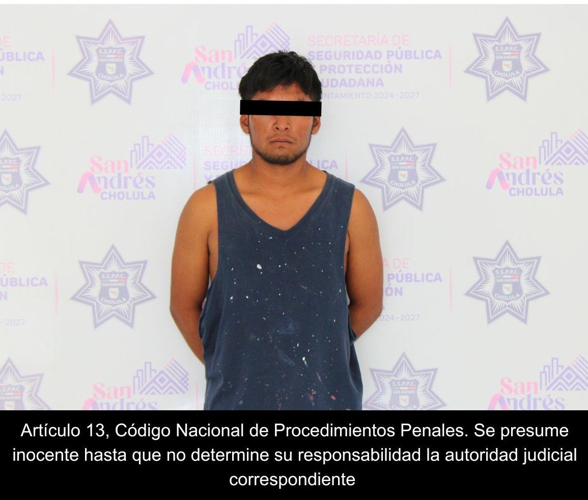San Andrés Cholula, Puebla.- En una acción coordinada entre la Secretaría de Seguridad Pública y Protección Ciudadana (SSPPC) de San Andrés Cholula, el Ejército Mexicano y la Policía Estatal Preventiva del Estado de Puebla, fue detenido en la colonia Gobernadores Jesús Ignacio “N.”, de 19 años de edad, como probable responsable de robo a casa habitación.